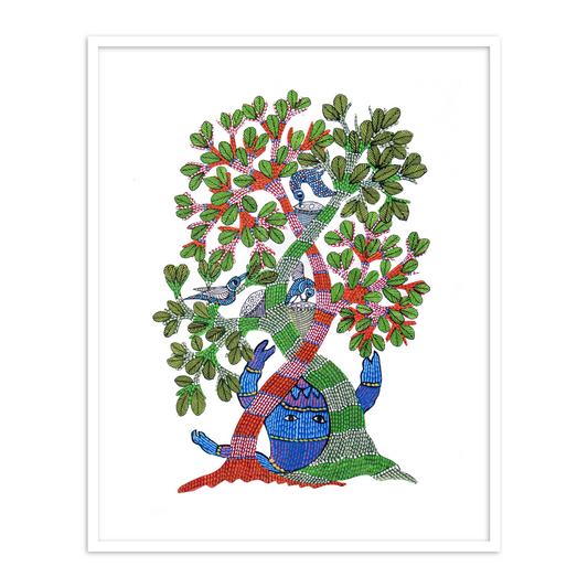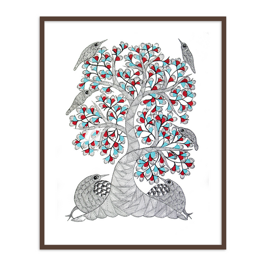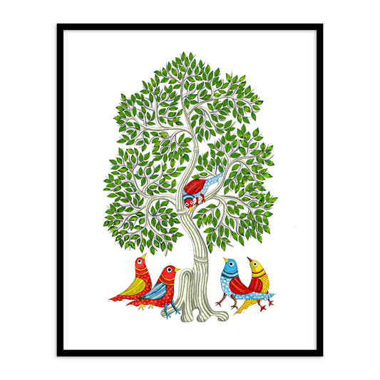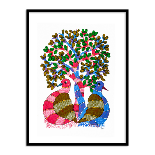 Pigeons sitting under a tree Gond painting | Indian Folk Framed Wall Art