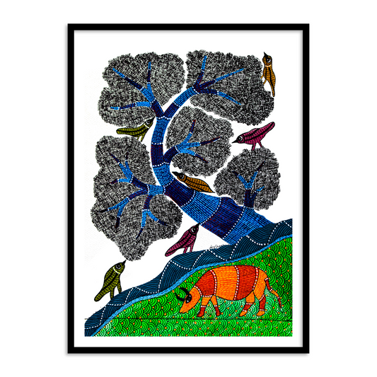 Cow and Birds Artwork | Traditional Gond Framed Wall Art