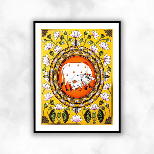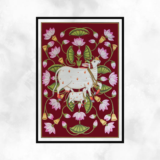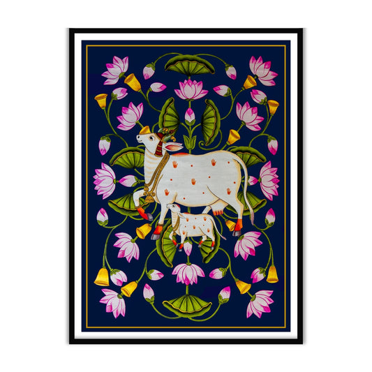 Lotus Pichwai Kamdhenu Cow with Calf | Indian Art for Home decor Wall Painting