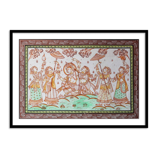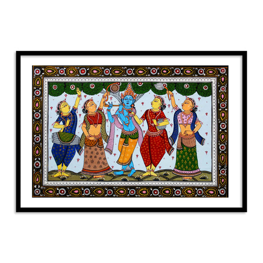 Shri Krishna with Gopiya Playing Flute | Pattachitra Folk Painting Framed Wall Art