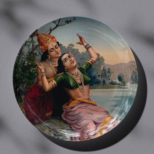 Arjuna in disguise a dancing teacher wooing Subhadra by Ravi Varma Ceramic Plate for Home Decor