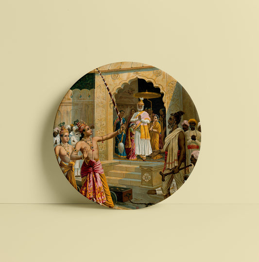 Rama breaks Shiva's bow in order to win the hand of Sita in front of the selection panel by Ravi Varma Ceramic Plate for Home Decor