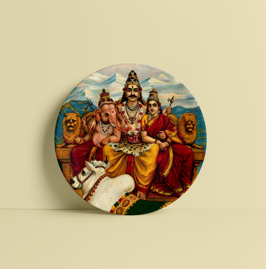 Shiva, Parvati and Ganesha enthroned on Mount Kailas by Ravi Varma Ceramic Plate for Home Decor