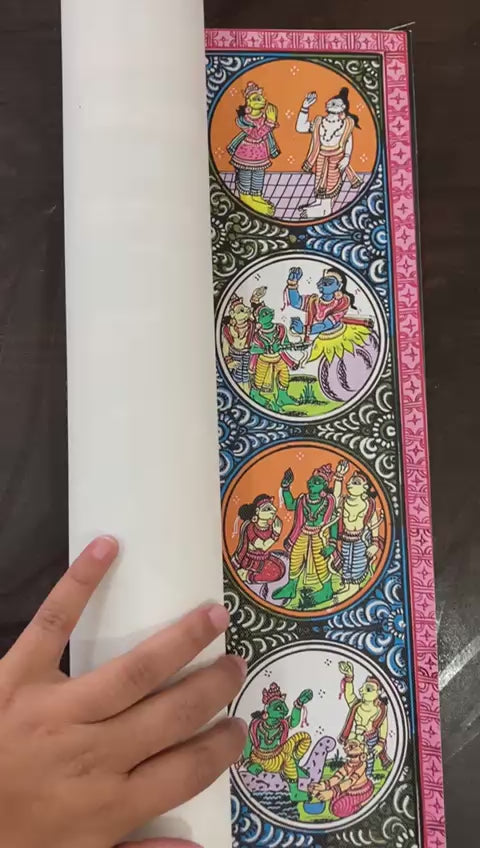 This Ram Darbar Pattachitra Art is one of the most ancient forms of artwork found in Odisha. Buy this exquisite Ram Darbar painting, a captivating masterpiece that radiates the divine beauty of Shri Ram. Invite the blessings of Shri Ram into your home, illuminating your living space with the sacred aura of his divine grace.